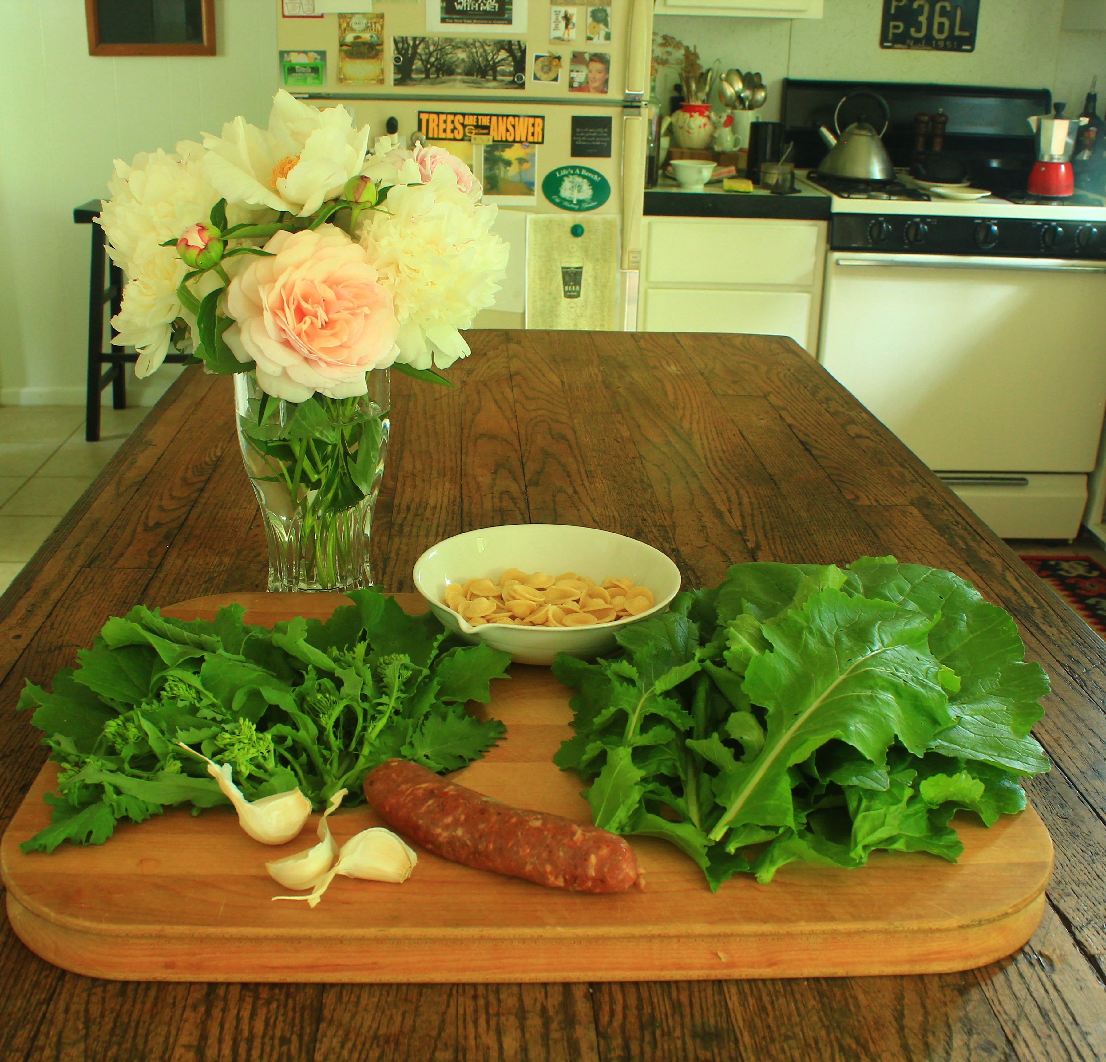 For a smoothie, she puts greens and water in the blender, lets that liquify, and then adds fruit and whatever else sounds interesting. The internet abounds with ideas. I put some wheat germ and avocado in with a frozen banana and a bunch of mixed greens (arugula, kale, chard, broccoli rabe, lettuce, parsley) and it was really good. Plus I felt so virtuous and healthy and clean. And if you harvest and wash a bunch of greens at one go, you’re ready to make them for a couple of days. Spa living at home!