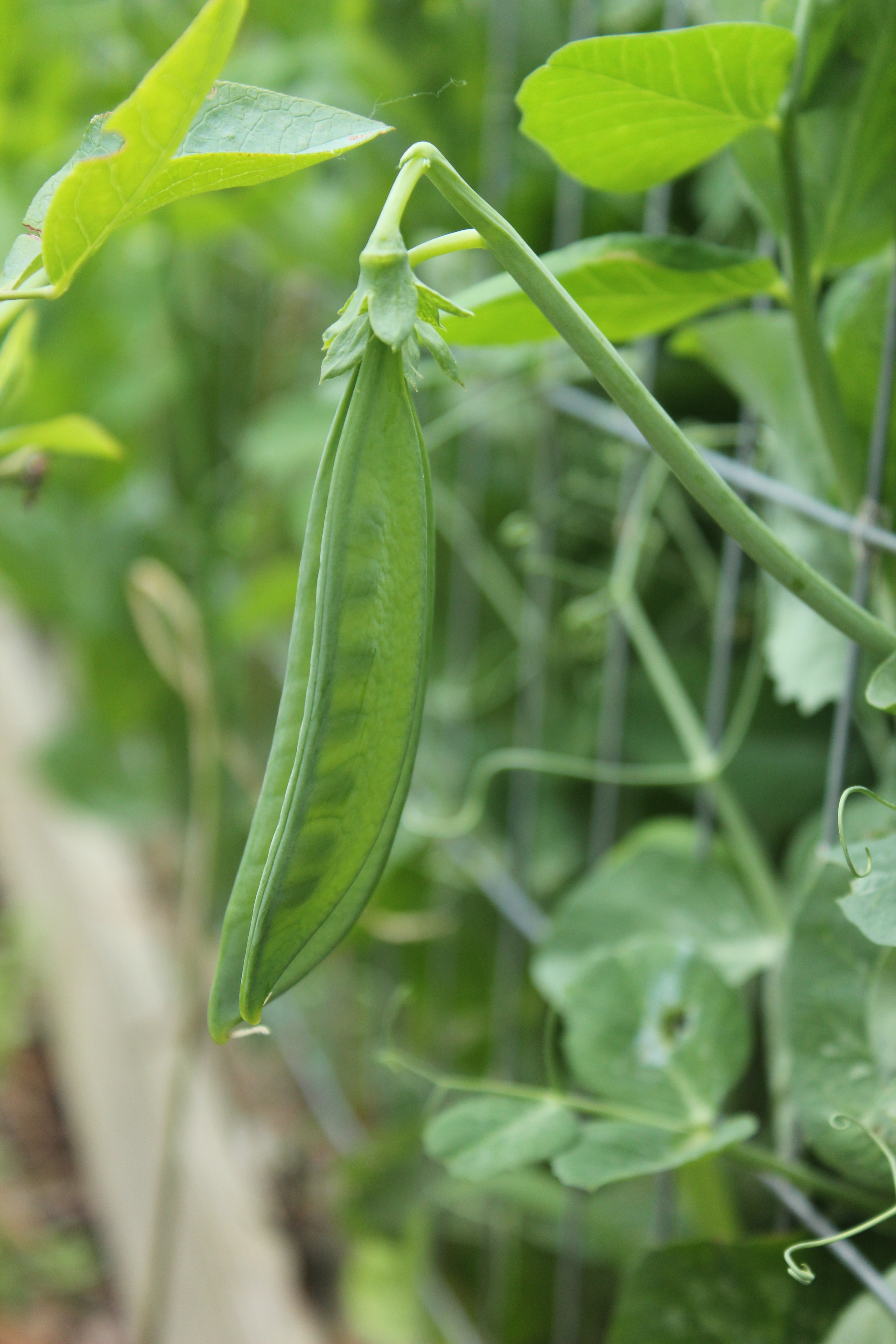 The sugar snap peas are getting nice and tall and have beautiful flowers, some of which are pink, but no peas yet. We’re still debating whether to give them something more to climb on. They seem pretty strong and stable on their own so far.