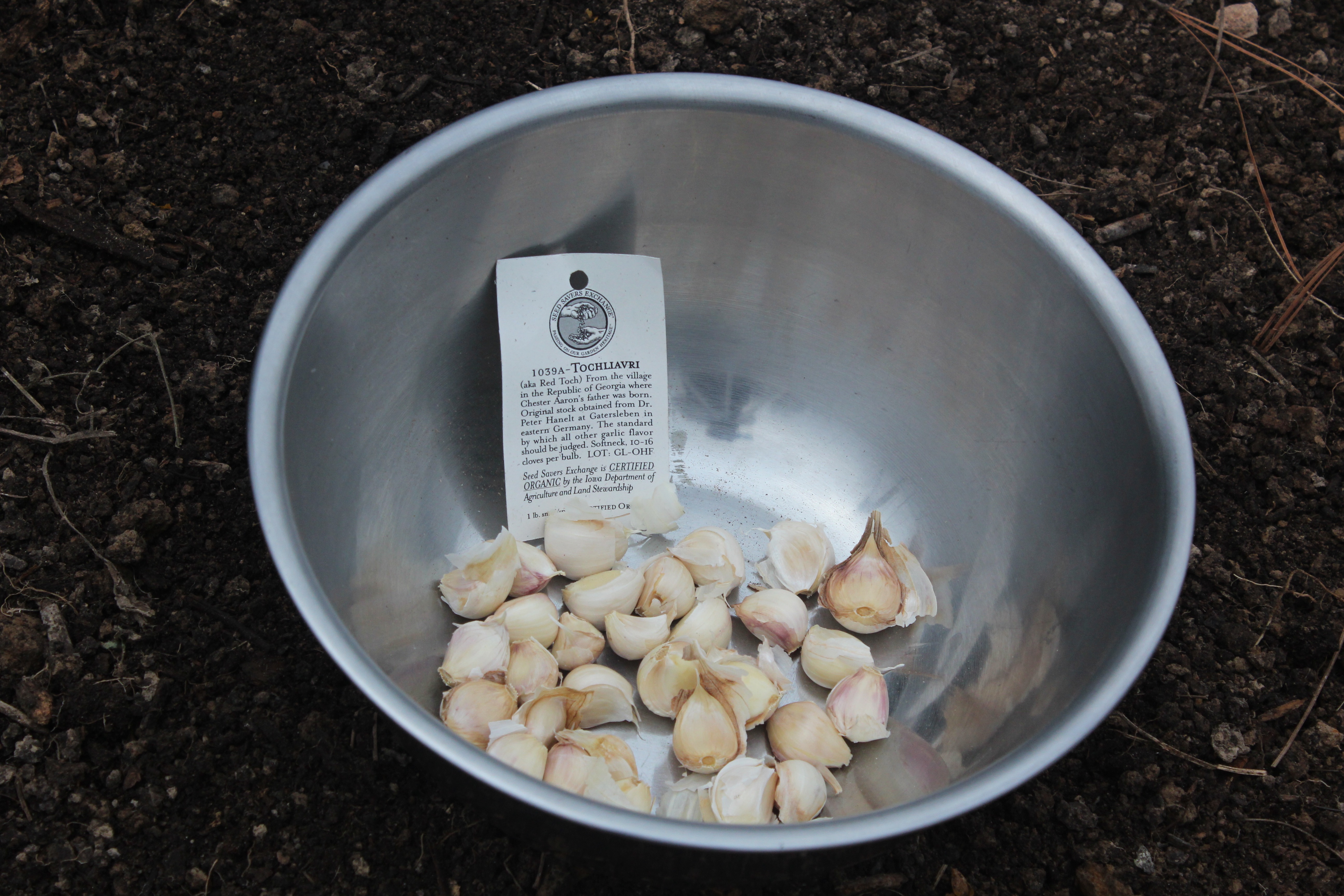 On November 20th I planted three kinds of garlic, about 40 cloves in total. Two softnecks, Tochliavri and Broadleaf Czech and a hardneck, German Red.